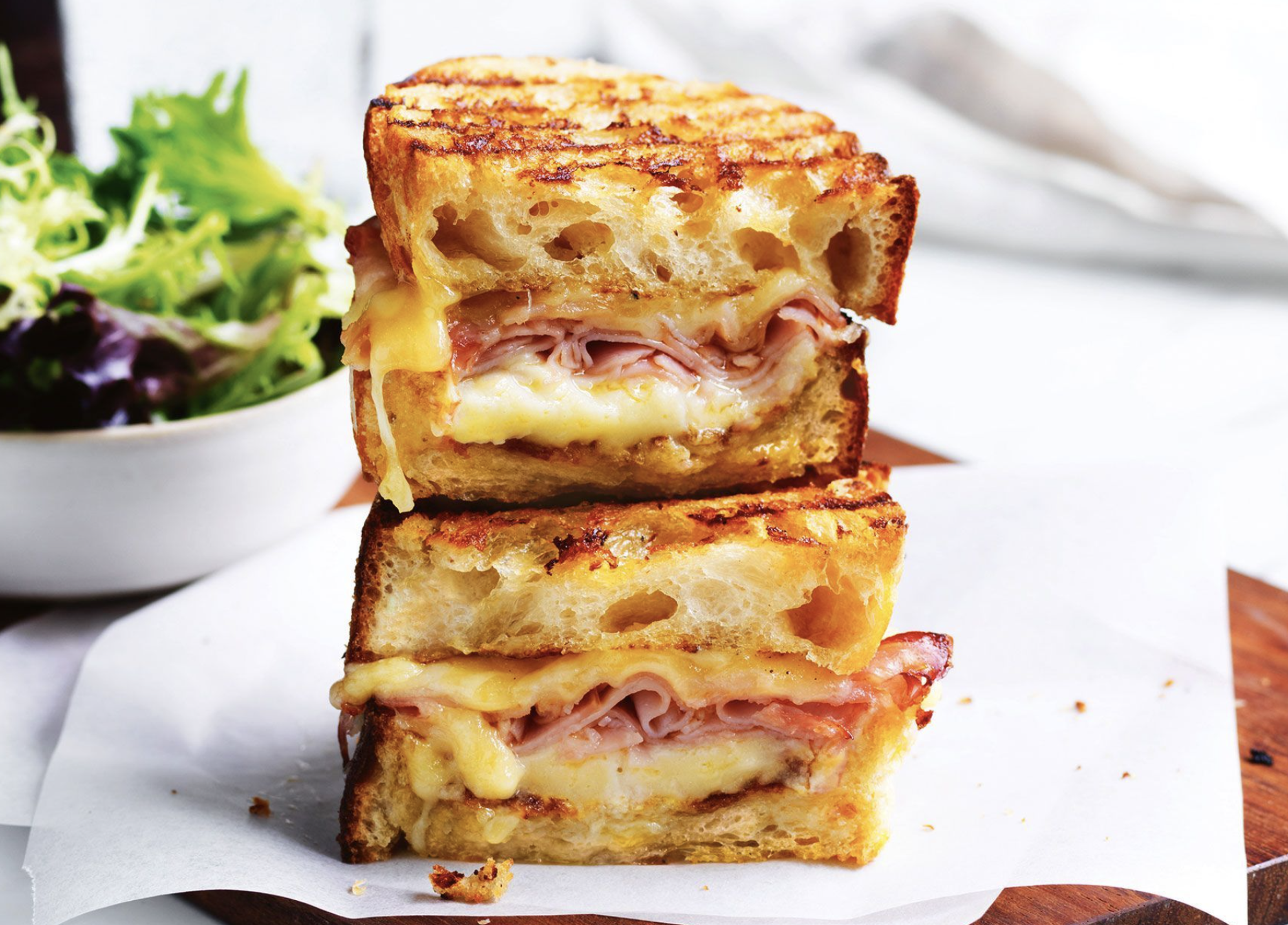 En klassiker i det franska köket som lär ha serverades som snabbmat i Paris första gången 1910. Det är onekligen den perfekta mackan med sin kombination av dijonsenap, ost och skinka. Servera den lätt ljummen med en fräsch och krispig sallad som brunch, lunch eller mellanmål.