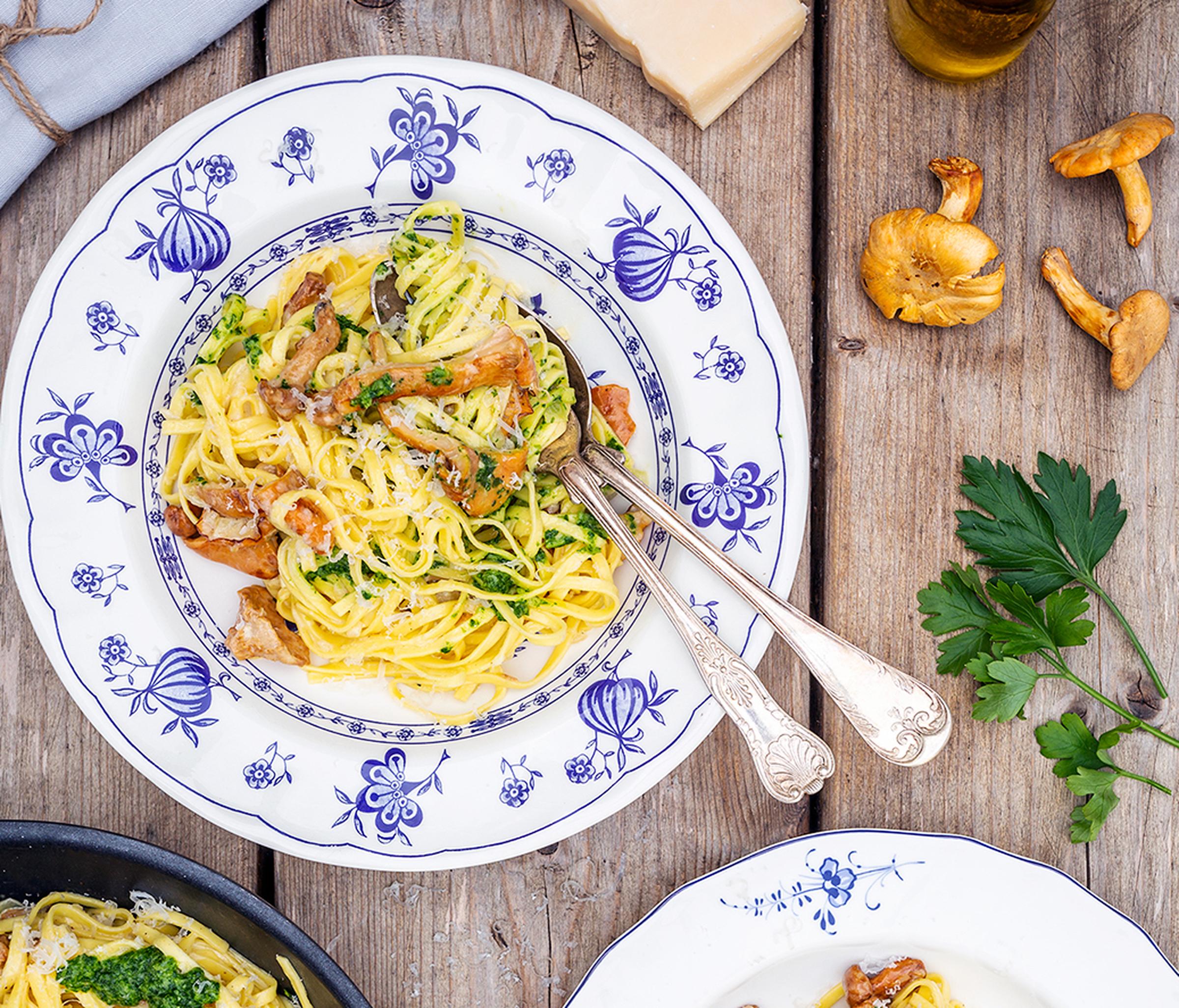 När svampsäsongen är här drömmer vi om skogens härliga och naturliga smaker i alla former. Här ett recept på en krämig pasta med smörstekta kantareller, grönkål, rostade valnötter och riven parmesanost. Och massor av persilja, såklart!