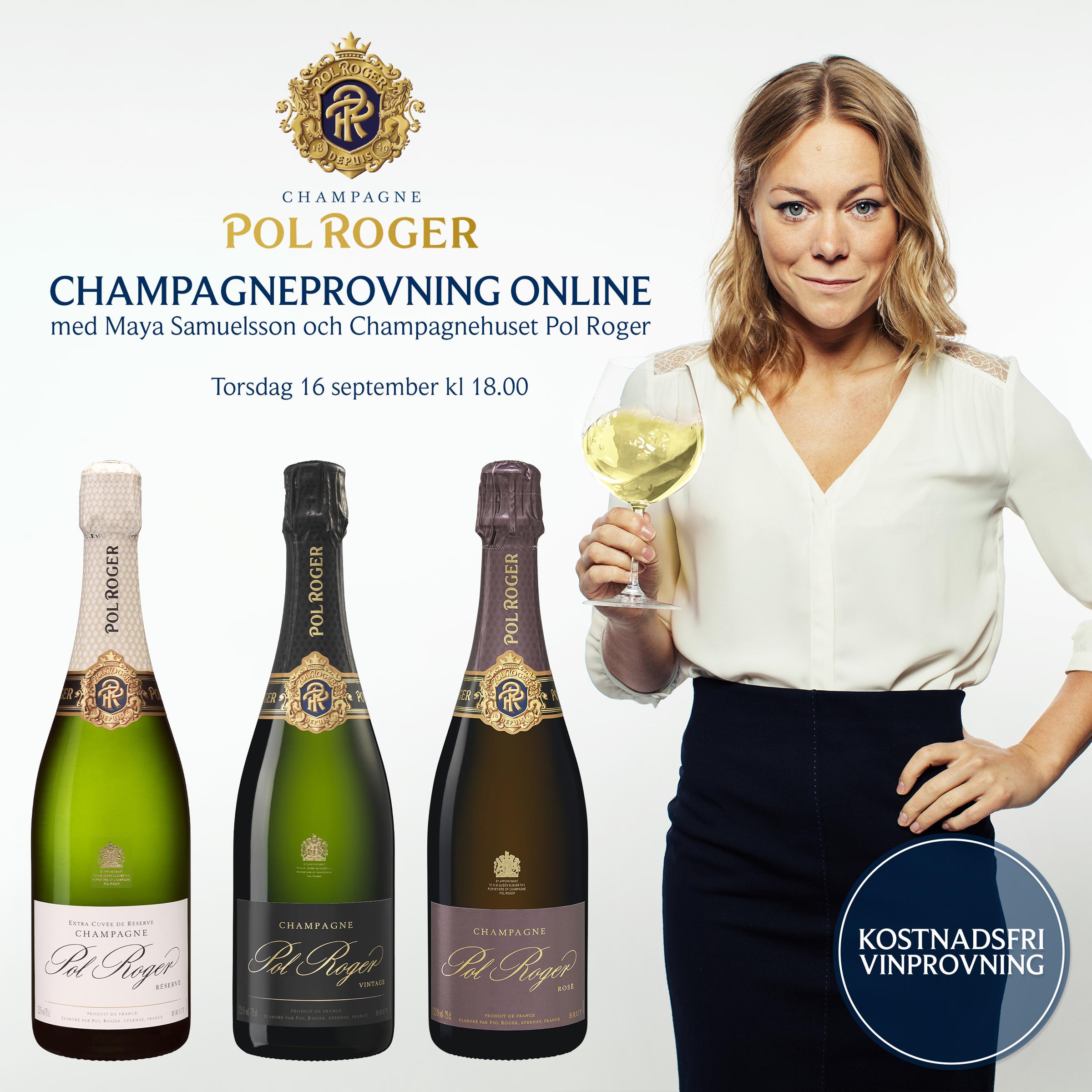 Onlineprovning med Maya Samuelsson från Vinkällan och TV4 och Fredrik Lindfors från Ward Wines som tar dig med på en provning i Champagnens underbara värld genom ett besök hos Champagnehuset Pol Roger.
